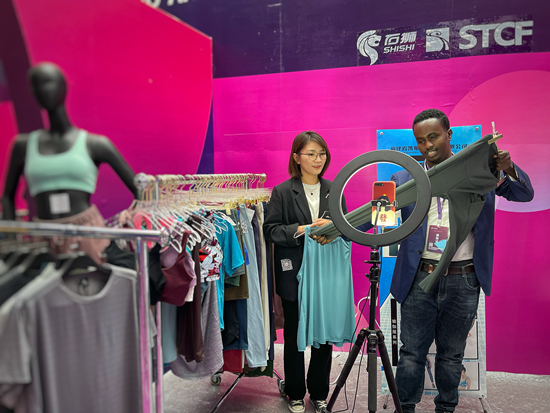 4月18日,在第二十四届海峡两岸纺织服装博览会上,中外主播合作进行跨境直播带货。