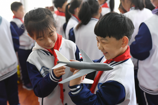 4月26日,青岛市郑州路小学的学生在研学课堂上观看3D打印出的飞机模型。当日,该校举办校园科技研学活动,让学生们参与开源硬件学习、3D打印技术、足球机器人竞赛等科教环节,激发学生探索科技奥秘的兴趣。王海滨/视觉中国