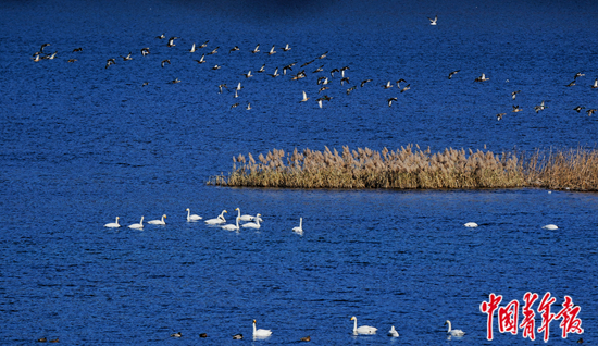 2020年12月7日,蓝天碧水下,一群天鹅在北京怀柔水库休憩,成为冬日里一道生态美景。中青报·中青网记者 李建泉/摄