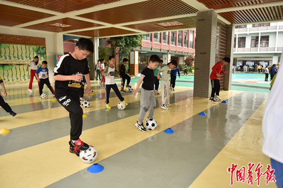 4月21日下午,桂林市榕湖小学的学生在上足球课。中青报·中青网记者 慈鑫/摄
