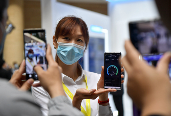 5月17日,工作人员在大会上用手机展示5G网络速度。