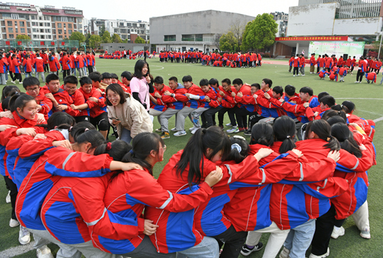 4月9日,安徽淮南市田家庵区民生中学九年级学生参加心理健康团训活动,“人椅”游戏培养大家互相信任的团队精神。 视觉中国供图