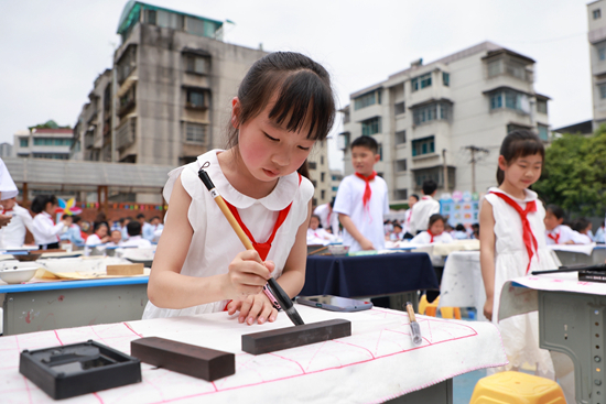 当日,“颂百年风华·育时代新人”贵阳市云岩区百名小学生现场书法展示活动在贵阳市第四实验小学举办,小学生们现场进行书法展示,书写内容以庆祝建党100周年和积极向上的相关名人名言为主。
