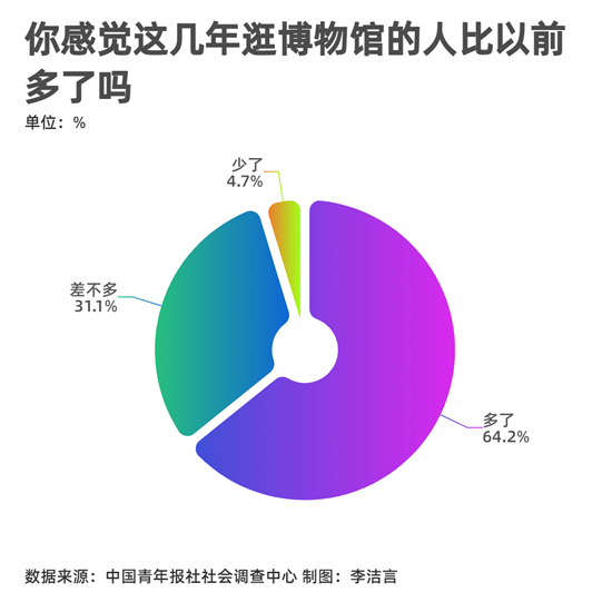 本次调查显示,64.2%的受访者感觉这几年逛博物馆的人比以前多了。