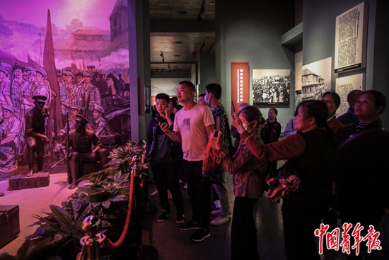 4月27日,江西井冈山革命博物馆,参观者在南昌起义的主题陈列前拍照留念。井冈山革命博物馆是中国第一个地方性革命史类博物馆,正值建党百年,这里的红色旅游日渐升温。
