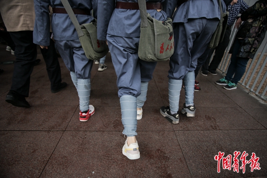 4月27日,江西井冈山革命博物馆外,参观者中不少年轻人身穿红军的“行头”,从帽子到绑腿一应俱全。