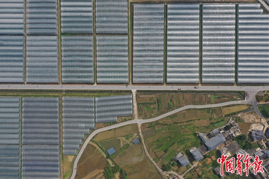 4月29日,江西赣州于都县梓山镇,从空中俯瞰富硒蔬菜生态产业园(无人机照片)。苏区革命时期,梓山是于都县早期革命活动最活跃的地区之一。2017年,这里投建富硒蔬菜产业园,带动周边2000多户贫困户脱贫增收。