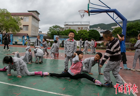 4月26日,广西桂林全州县凤凰镇,和平红军小学的学生在课间玩耍。这所小学附近的凤凰嘴渡口,是1934年红军长征过湘江的四大渡口之一。