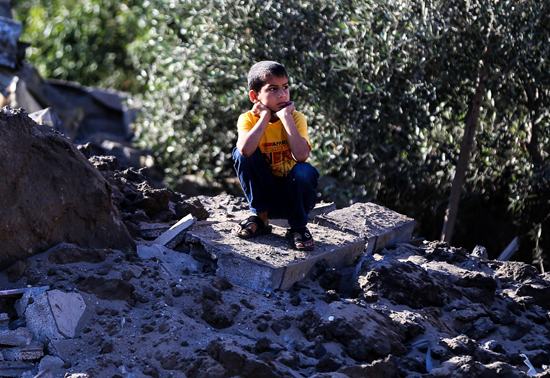 当地时间5月18日,在加沙地带城市汗尤尼斯,一名巴勒斯坦儿童蹲在被以军空袭摧毁的一处房屋废墟中。连日来,以色列与巴勒斯坦加沙地带武装组织之间严重冲突持续。 亚西尔/摄(新华社发)