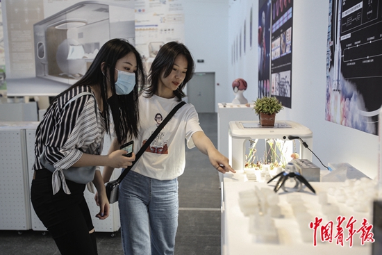 5月12日,北京,清华大学美术学院,两名观众在一组对可折叠植物形态研究和设计应用的作品前参观。这件作品是基于可折叠植物形态研究的空间清理航天器的概念设计。近日,清华大学美术学院2021届硕士研究生毕业作品展在清华大学艺术博物馆开幕,展览以“向多样的世界提问”为主题,共展出了200名硕士毕业生的1000余件/组作品。本次展览是疫情之后清华美院首次在线下举办的研究生作品展,毕业生们通过艺术的视角,展现对历史、社会、环保、人文等不同议题的关注。