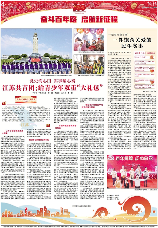 团江苏省委书记司勇说,党史学习教育开展以来,江苏各级团组织把青少年学习教育摆在重要位置,着眼立心铸魂、启智润心,把准青少年认知特点和成长需求,用好用活百年党史这座精神富矿,深入挖掘党在江苏大地的浴血奋战史、艰苦创业史、改革创新史,教育引导全省广大青少年学党史、强信念、跟党走。