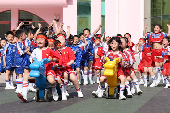 5月27日,江苏连云港市赣榆实验幼儿园的迎“六一”活动中,小朋友们参加“旱地龙舟”趣味比赛。司伟/视觉中国
