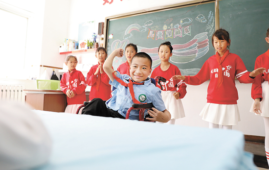 本应在特教学校念书的张斯梦能来到普校,离不开学校的接纳和鼓励。班主任邢秀艳老师和全班同学也给了他更多的关注与关心。每天邢老师都会和张斯梦聊天,鼓励同学们主动和他交流,让他感受到自己永远是班级的一员。新华社记者 姚剑锋/摄