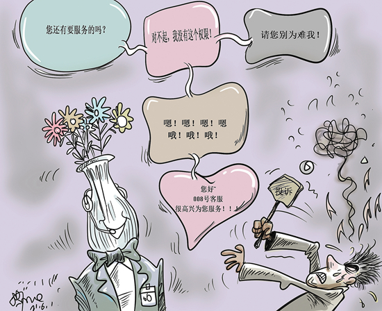 问卷调查结果显示,超过一半消费者遭遇过客服难题。智能客服不智能、线上客服较隐蔽、人工客服藏得深、客服电话难打通,不仅影响消费体验,也成为阻碍消费需求释放的“拦路虎”。(《工人日报》6月1日)漫画:徐简
