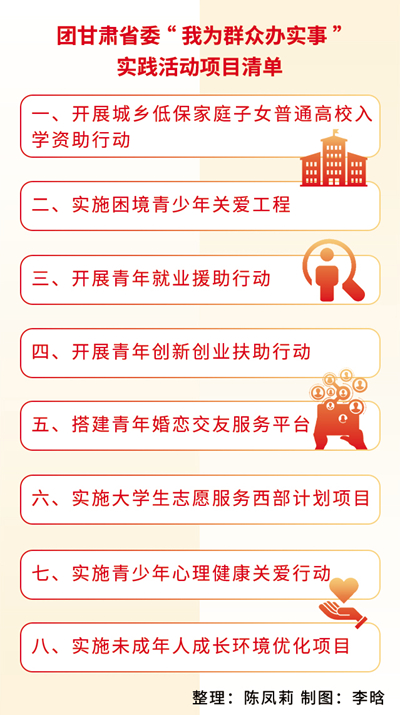 近日,团甘肃省委在充分调研的基础上,针对特定人群的成长成才迫切需求,发布了《“我为群众办实事”实践活动重点项目清单》,从八个方面开展重点项目(见图表)。