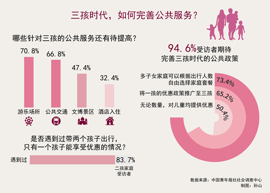 日前,中国青年报社社会调查中心通过问卷网(wenjuan.com),对2004名受访者进行的一项调查显示,83.7%的二孩家庭受访者表示遇到过带两个孩子出行只有一个孩子享受优惠的情况,89.9%的二孩家庭受访者表示公共服务不到位,给自己带来了困扰。94.6%的受访者期待完善针对三孩的公共政策。