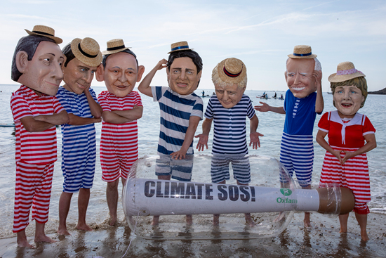 当地时间6月12日,英国康沃尔,在G7峰会举行期间,乐施会活动人士装扮成七国集团领导人,呼吁七国进一步落实减排目标,并提供更多资金帮助最脆弱国家应对气候变化。人民视觉供图
