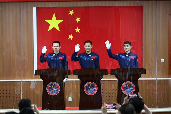 6月16日,神舟十二号载人飞行任务航天员聂海胜(中)、刘伯明(右)和汤洪波在酒泉卫星发射中心与记者见面。新华社记者 琚振华/摄