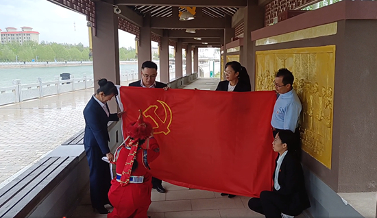 6月8日,团海西蒙古族藏族自治州委党团干部在德令哈市党建长廊共绣一面党旗。