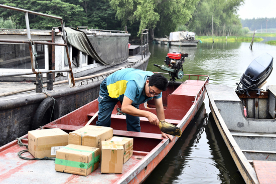 6月20日,在山东省济宁市微山县南阳镇,邮递员王少朋在清理邮船上的积水。位于微山湖北端的南阳镇四面环水,交通不便,生活物资和邮件包裹全靠船进船出。36岁的共产党员王少朋,自2007年工作以来就一直负责着微山县邮政分公司南阳支局唯一一条水上邮路。这条邮路,沿线共有7个自然村,王少朋每投递一班一圈走下来60多公里。一人一船一邮路,王少朋一走就是14年。
