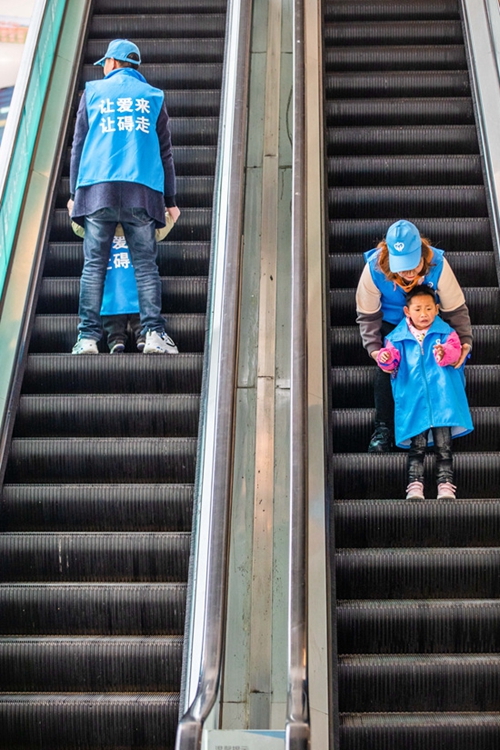 4月3日,第十四届“世界孤独症关注日”公益活动现场,志愿者教自闭症孩子乘坐电梯。 视觉中国供图