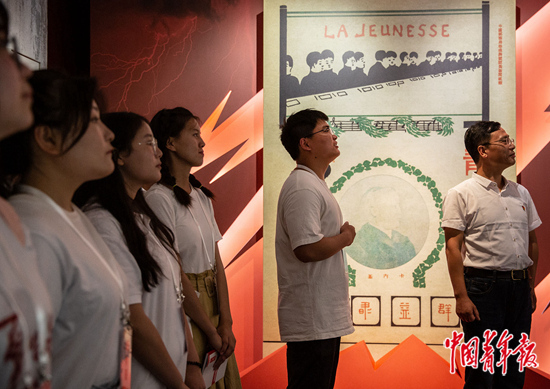7月7日,北大红楼,北京红色教育资源融入思政课实践教学示范教学课上,大学生代表在《新青年》杂志更名前的《青年杂志》创刊号前,朗诵陈独秀的《敬告青年》:“青年如初春,如朝日,如百卉之萌动,如利刃之新发于硎,人生最可宝贵之时期也。”据介绍,这是北大红楼修缮并重新开放后首个在此进行的高校思政课堂。中青报·中青网记者 李峥苨/摄