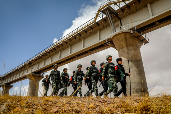 5月16日,武警青海总队执勤支队官兵联合青藏铁路派出所民警组成联合巡逻组,沿青藏铁路沿线巡逻。杨浩/摄