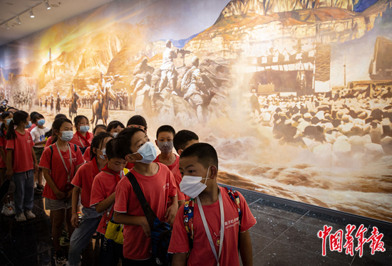 7月7日,北京,中国人民抗日战争纪念馆,来自四川绵阳的小学生正在老师的带领下排队观看“中流砥柱——中国共产党抗战文物专题展”。