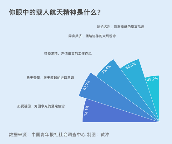 什么是青少年眼中的载人航天精神?中国青年报社社会调查中心通过问卷网(wenjuan.com),在2047名14-35岁青少年中进行的专项调查显示,青少年眼中的载人航天精神,包括勇于登攀、敢于超越的进取意识(81.7%),精益求精、严慎细实的工作作风(75.4%),热爱祖国、为国争光的坚定信念(74.1%)等。