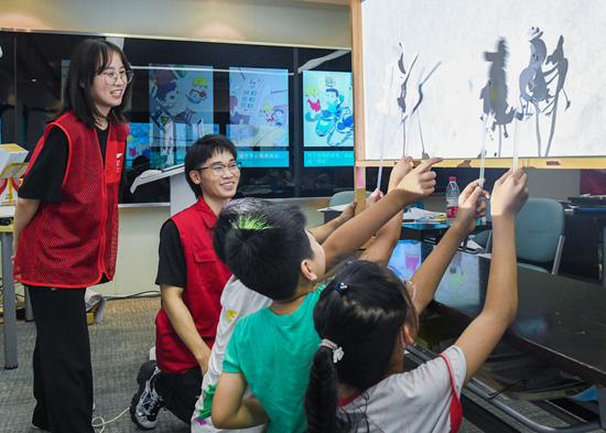 7月8日,学生们用自己制作的皮影作品进行趣味表演。