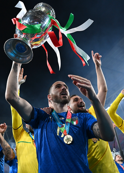 北京时间7月12日,意大利队在点球大战中击败英格兰队,时隔53年再度捧起欧洲杯。图为夺冠功臣博努奇捧杯庆祝。视觉中国供图