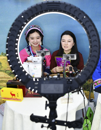 7月12日,在2021年生态文明贵阳国际论坛绿色产品展区,参展商在直播产品。当日,以“低碳转型 绿色发展——共同构建人与自然生命共同体”为主题的2021年生态文明贵阳国际论坛拉开帷幕。新华社记者 杨文斌/摄