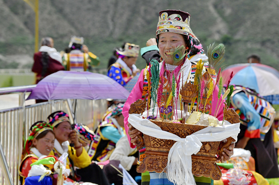 7月9日,共康村村民端着切玛盒庆祝“望果节”。