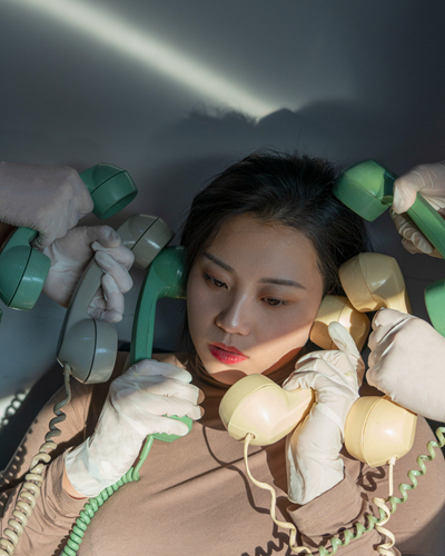 同样是以个人真实经历为灵感,鲁迅美术学院摄影专业硕士毕业生王钰莹的作品《你好,陌生人》则是将图像作为“讲故事”的媒介。因为手机号码的上一位使用者没有注销,从2019年的4月至今,王钰莹陆续接到一些陌生人的短信和来电,其中有广告推销,也有催债的法律文书。不堪其扰的她试图搞清楚整件事情的始末,也逐渐开始好奇电话号码曾经的主人究竟是谁。最终,王钰莹决定以此作为毕业创作的选题,她找到一名模特“扮演”自己,搭建场景、制作道具,将自身遭遇信息泄露的经历编排成一幕幕精心设计的情景,最终串联起一个看似荒诞却极有可能发生在我们身边的故事。