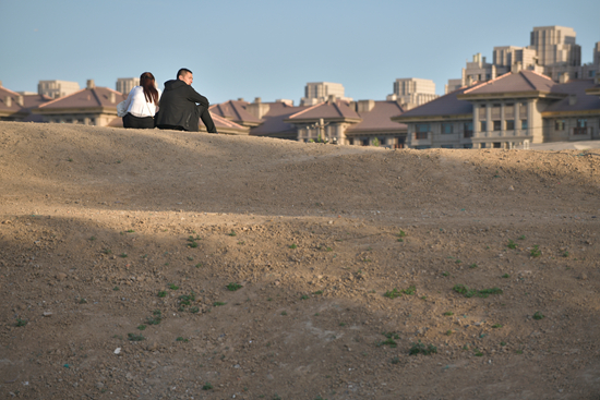 2021年5月8日,北京四路居,父母坐在新建的高档楼盘前的土坡上。由于工作和经济上的原因,他们从2007年开始在四路居附近住了9年,其间搬过5次家。父母出生在安徽芜湖的农村,20年前来到北京,父亲做装修,母亲从事家政服务。