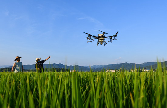7月14日,在湖南省衡阳市常宁市洋泉镇土桥村,农技员操作植保无人机为水稻进行飞防作业。