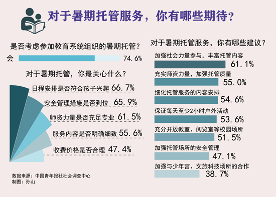他表示,暑期托管服务可以不局限在学校开展,像少年宫、图书馆等公共场所都可以开展暑期托管服务。“暑期托管的服务人员不一定非要是学校的老师。可以将图书馆、少年宫工作人员纳入到暑期托管服务的指导老师队伍,丰富教师来源。还有大学生、研究生,也可以参与到暑期托管服务中”。