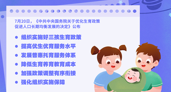 本报北京7月20日电(中青报·中青网记者 惠滢)《中共中央 国务院关于优化生育政策促进人口长期均衡发展的决定》(以下简称《决定》)今天公布,就“实施一对夫妻可以生育三个子女政策,并取消社会抚养费等制约措施、清理和废止相关处罚规定,配套实施积极生育支持措施”提出要求。扩大新生儿疾病筛查病种范围,支持有条件的地方开展父母育儿假试点,鼓励和支持有条件的幼儿园招收2至3岁幼儿……这一决定从提高优生优育服务水平等多个方面提出了覆盖全生命周期的一揽子支持举措。