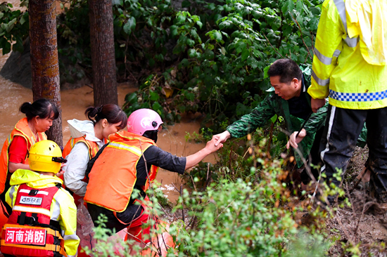 7月20日,消防救援人员在转移被困村民。当日,河南省登封市唐庄镇龙头村附近突发山洪,郑州市消防救援支队特勤大队紧急赶赴现场,转移村民50余人至安全地带。