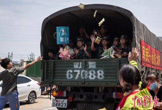 7月29日上午,河南省郑州市中原区,武警第一机动总队某支队完成救灾任务准备撤离,附近五龙口村的居民前来送别。
