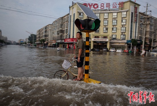 7月23日下午,河南省卫辉市街头,一位居民在积水中推车行进,中途在交通岗亭上停留。当日,卫辉市街道内涝严重。中青报·中青网记者 李峥苨/摄