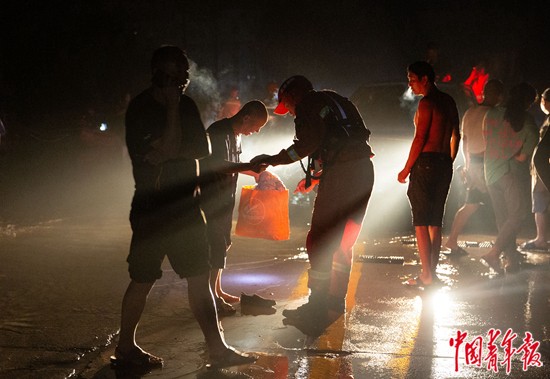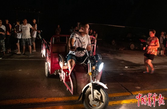 7月23日晚,河南省卫辉市唐岗村,35岁的个体户肖文明骑着三轮车义务往返于搜救点和位于附近几所小学的安置点之间,运送无处安置的获救居民。近3天,肖文明都在各处参与救援,前天因为在水中运输居民,弄坏了自己的卡车,这天只好换三轮车继续。他的家人做了粥和面食分发给现场获救群众。23日的救援持续至第二天深夜2点,他说,这一天他来回送人跑了50多趟。中青报·中青网记者 李峥苨/摄
