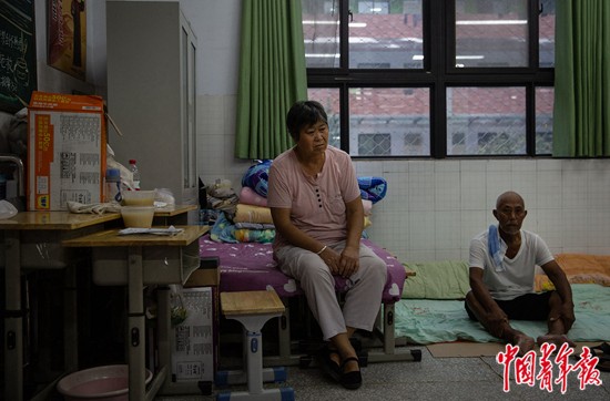 7月27日,河南省新乡市牧野区,受灾村民在新中大道小学安置点内。22日晚接到紧急转移通知后,卫河周边的临清店村、前河头村、后河头村等村镇3000多名村民撤离到新中大道小学安置点,后经安排疏散到周边其他安置点。目前,新中大道小学安置点内仍有600多名受灾村民。中青报·中青网记者 李峥苨/摄