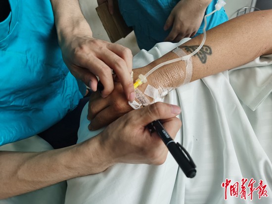 7月22日,河南省郑州市中牟县阜外华中心血管病医院,医护人员在每一位病人身上写上转运时间、姓名和手机号。当日,受暴雨影响,阜外华中心血管病医院内积水严重,数千人被困。消防、部队、红十字会等救援力量加入,帮助受困人员紧急转院。中青报·中青网记者 耿学清/摄