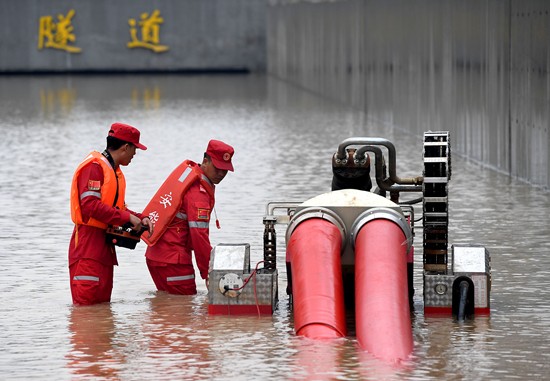 7月22日,河南省郑州市,来自江西的救援人员在郑州市京广南路隧道进行排涝作业。目前,京广路隧道的积水排放工作已经结束。截至发稿,现场排查发现6名遇难者。新华社记者 李安/摄