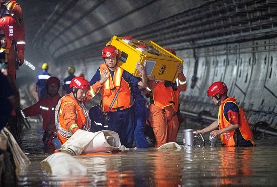 7月26日晚,河南省郑州市,郑州地铁5号线隧道内,武汉市消防救援支队消防指战员正在搬运抽水发电设备。7月20日,郑州突降罕见特大暴雨,地铁5号线内严重积水,14人不幸遇难。7月26日晚,武汉消防救援队连夜深入地铁5号线内部开展排涝作业。经过一夜的不间断作业,5号线河南省人民医院站隧道内积水水位有明显下降。艾诗洋/摄