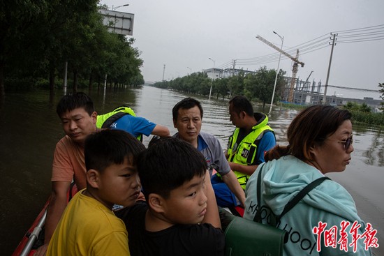 7月23日,河南省新乡市牧野区,一支来自山东的民间救援队从曲韩社区和附近工业园区救出受困居民和员工后,驾驶橡皮艇驶向积水较浅的区域,身后是被淹没的工业园区。中青报·中青网记者 李峥苨/摄