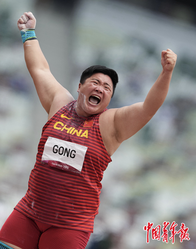 8月1日,东京奥运会女子铅球决赛上,巩立姣高举双臂庆祝胜利。巩立姣在比赛中以20米58的成绩夺冠,获得该项目的金牌。中青报·中青网特派记者 刘占坤/摄