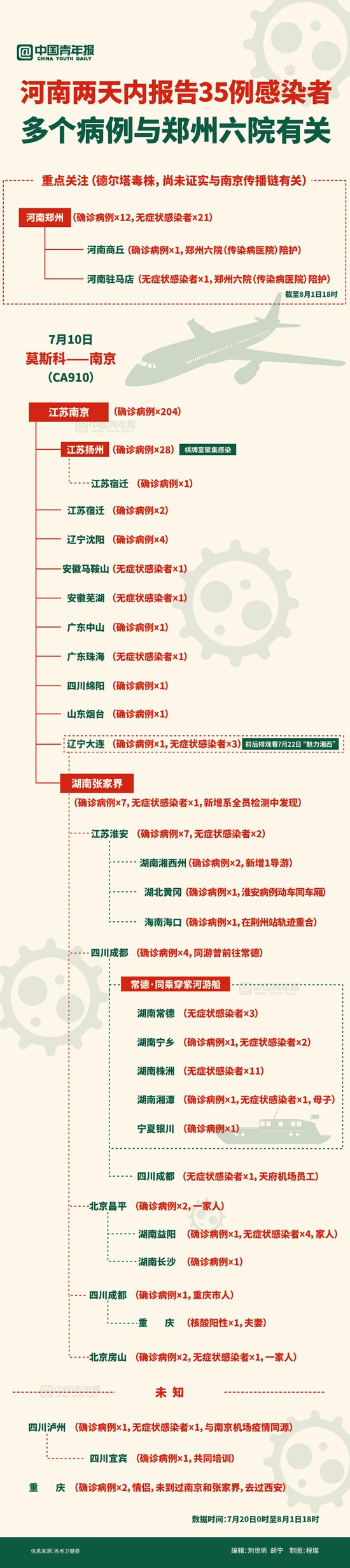 7月29日,北京新增两例本土确诊病例,系夫妻二人,两人7月20日曾前往湖南省张家界旅游。8月1日,山东烟台确诊一例病例,系禄口机场工作人员的密切接触者。8月1日,北京新增两例京外关联本地新冠肺炎确诊病例和1例无症状感染者,来自同一家庭,抵京前向社区报备有张家界旅行史。