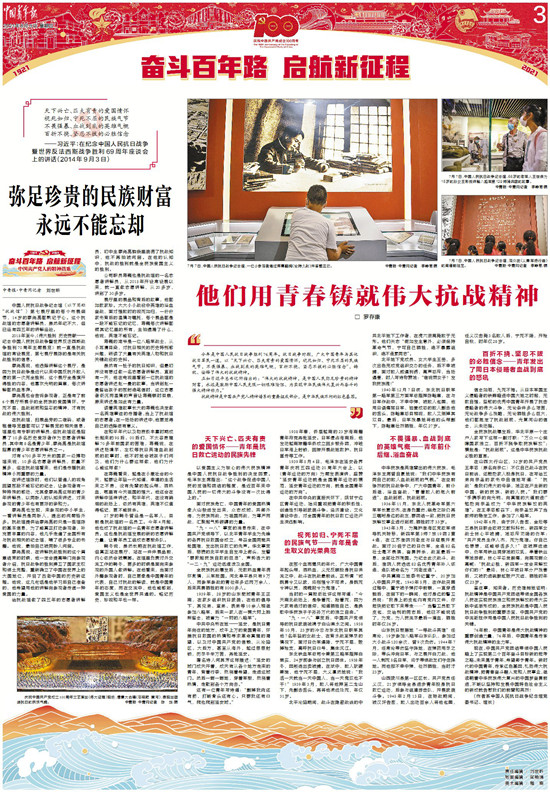 现在,中国共产党团结带领中国人民踏上了实现第二个百年奋斗目标新的赶考之路。未来属于青年,希望寄予青年。 新时代的中国青年,传承红色基因,弘扬伟大抗战精神,把青春奋斗融入党和人民事业,继续朝着中华民族伟大复兴的中国梦奋勇前进,不断以坚持和发展中国特色社会主义的新成就告慰我们的前辈和英烈!
